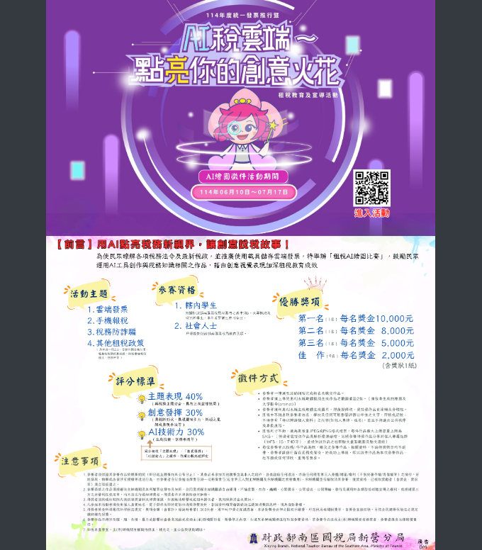 財政部南區國稅局新營分局「AI稅雲端~點亮你的創意火花」之租稅AI繪圖徵件活動文宣電子檔,活動辦法公告周知,鼓勵參加